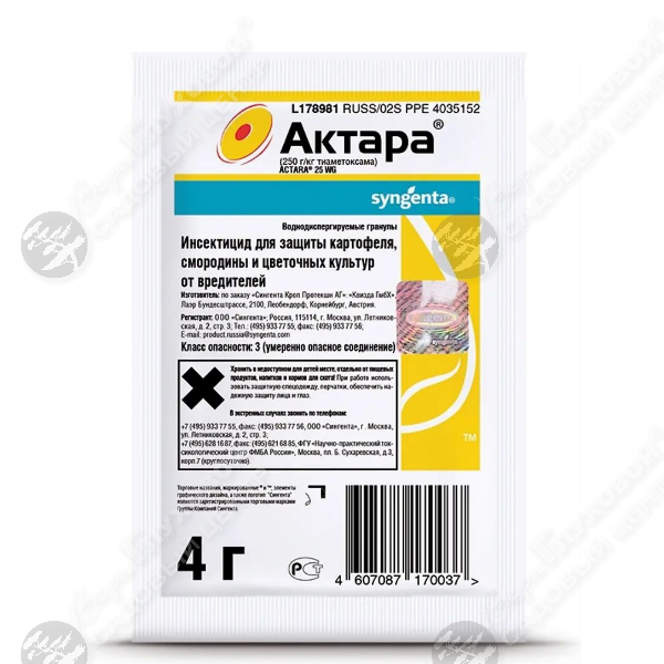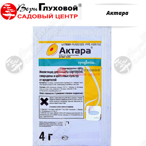 Актара – сильнейший инсектицид для защиты картофеля, смородины и цветочных культур от вредителей. Воднодиспергируемые гранулы. Проникая внутрь растения сохраняет длительную активность против основных вредителей сельскохозяйственных культур. Позволяет бороться со многими видами вредителей.